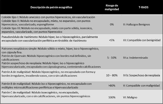 Figura 1. Patrones ecográficos de nódulos tiroideos y su correlación con malignidad histológica. Adaptación de Tabla 1 en: Horvath E, Majlis S, Rossi R, Franco C, Niedmann JP, Castro A, Dominguez M. An ultrasonogram reporting system for thyroid nodules stratifying cancer risk for clinical management. J Clin Endocrinol Metab. 2009;90(5):1748-51