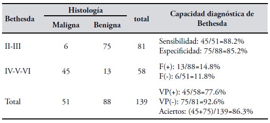 En una muestra donde la prevalencia de cáncer fue del 36.7% (51/139), la clasificación Bethesda demostró una muy buena capacidad para sospechar malignidad: 88.2% y también para sospechar benignidad: 85.2%. Los aciertos de la clasificación Bethesda fueron del 86.3%. La clasificación informó falsamente un cáncer (F+) en el 14.8% de los nódulos, e informó falsamente una patología benigna (F-) en el 11.8% de los nódulos. Con un Bethesda con alta sospecha demalignidad, la probabilidad de que, efectivamente, el nódulo fuere un cáncer tiroideo fue del 77.6% Y si la citología informase baja sospecha de malignidad, la probabilidad que el nódulo fuere benigno fue del 92.6%.