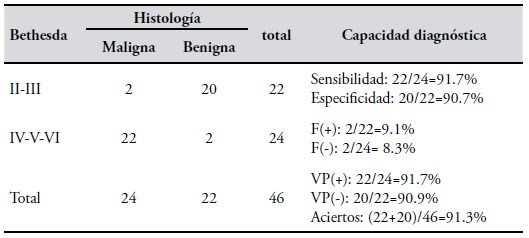 Capacidad diagnóstica de la PAAF (categorizada con sistema Bethesda). La Tabla III muestra la capacidad diagnóstica del sistema Bethesda. Se agruparon las categorías en alta y baja sospecha de malignidad antes definidas y se contrastaron con los resultados de la histología de la pieza quirúrgica (maligna/benigna).
