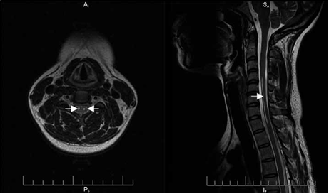 La IRM (imagen de resonancia magnética) de médula cérvico-dorsal mostró en sector anterior dos imágenes tubulares, hiperintensas en T2, hipointensas en T1, sin refuerzo con contraste (Fig. 2). Los estudios de conducción nerviosa y la electromiografía mostraron signos de compromiso axonal motor de nervio cubital y mediano en miembro superior derecho y signos denervatorios en territorio C6 y C7 bilateral. Se dosaron anticuerpos GM1 en sangre con resultado negativo.