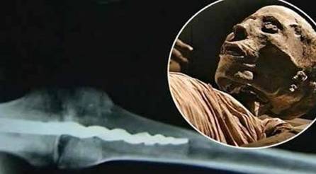 Así lo afirma la versión digital del diario Daily Express, donde se señala que el doctor Richard Jackson –cirujano de la Universidad de Brigham Young– ha encontrado dentro de una momia con 3.000 años de antigüedad un tornillo ortopédico de hierro de unos 23 centímetros. Concretamente, el artilugio fue hallado en la rodilla de ese sujeto, el cual falleció entre los siglos XVI y XI a.C. El experto ha podido determinar que el artefacto fue unido al hueso mediante resina orgánica, un producto parecido (salvando las distancias) al cemento óseo que se usa hoy en día (ver la figura).