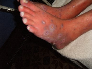 Cuando nosotros tomamos contacto con el paciente por pedido de su familia, el mismo llevaba casi 2 años en este estado. Evidenciaba un cuadro depresivo importante debido a esta situación, su estado nutricional era muy malo (Evaluación Global Subjetiva: C) y tenía múltiples úlceras en miembros inferiores con sobre infección micótica de las mismas (cándida albicans), debidas a inmersión permanente de ambos miembros inferiores en agua.(Figs. 1 -2)