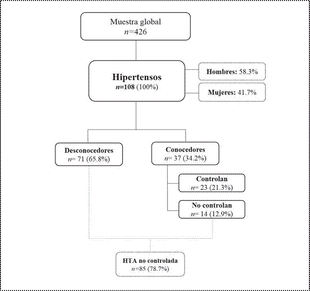 Resultados. Incluyó 426 individuos: 108 (25.4%) presentaron cifras de HTA -estudiantes 7%, médicos 14.2%, enfermeros 3.7% (p=0.003)-. Ser médico se relacionó con mayor riesgo de presentar HTA (p=0.018). Los estu- diantes desconocieron la condición con mayor frecuencia (p=0.006). Los enfermeros tuvieron mayor conocimiento (p=0.003) y mejor control (p=0.017).