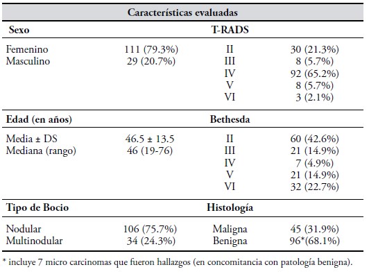 Características de casos incluidos. Las características de los 138 pacientes y de los 139 nódulos incluidos se describen en la Tabla I. Se trató de un grupo mayoritariamente femenino, de 46 años de edad promedio; 3/4 bocios operados fueron multinodulares. El examen anátomo patológico identificó 51 nódulos con cáncer tiroideo y 88 con histología tiroidea benigna; en concomitancia con la patología benigna se identificaron 7 micro carcinomas que no fueron tenidos en cuenta para la clasificación maligna/benigna en este estudio, por ser hallazgos de la anatomía patológica diferida.