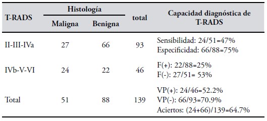 Los aciertos de la clasificación T-RADS con la histología de la pieza quirúrgica fueron de casi el 65%. Esta clasificación identificó con baja sospecha de malignidad a tres de cada cuatro patologías benignas y reportó con baja sospecha de malignidad al 53% de los cánceres.