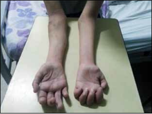 Figura 1. Atrofia de antebrazos y manos con predominio en miembro superior izquierdo.