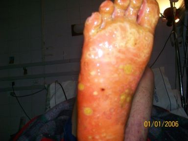 Cuando nosotros tomamos contacto con el paciente por pedido de su familia, el mismo llevaba casi 2 años en este estado. Evidenciaba un cuadro depresivo importante debido a esta situación, su estado nutricional era muy malo (Evaluación Global Subjetiva: C) y tenía múltiples úlceras en miembros inferiores con sobre infección micótica de las mismas (cándida albicans), debidas a inmersión permanente de ambos miembros inferiores en agua.(Figs. 1 -2)