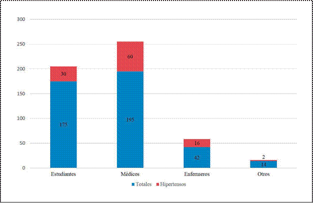 Resultados. Incluyó 426 individuos: 108 (25.4%) presentaron cifras de HTA -estudiantes 7%, médicos 14.2%, enfermeros 3.7% (p=0.003)-. Ser médico se relacionó con mayor riesgo de presentar HTA (p=0.018). Los estu- diantes desconocieron la condición con mayor frecuencia (p=0.006). Los enfermeros tuvieron mayor conocimiento (p=0.003) y mejor control (p=0.017).