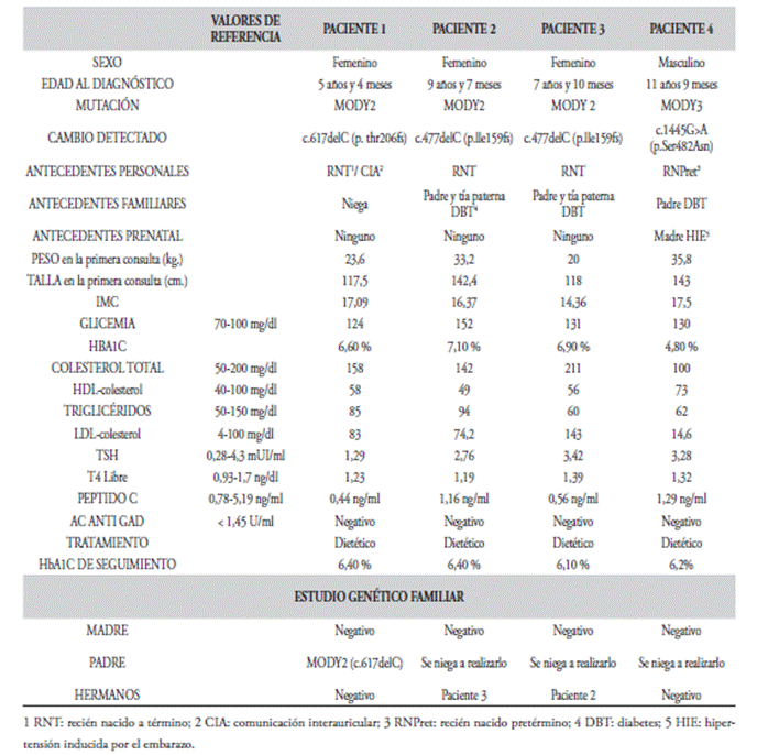 A continuación se exponen los casos de cuatro pacientes en los cuales se les realizó el diagnóstico (mediante el estudio genético) de MODY 2 en 3 de ellos (2 de ellas son hermanas) y de MODY 3 en el restante.